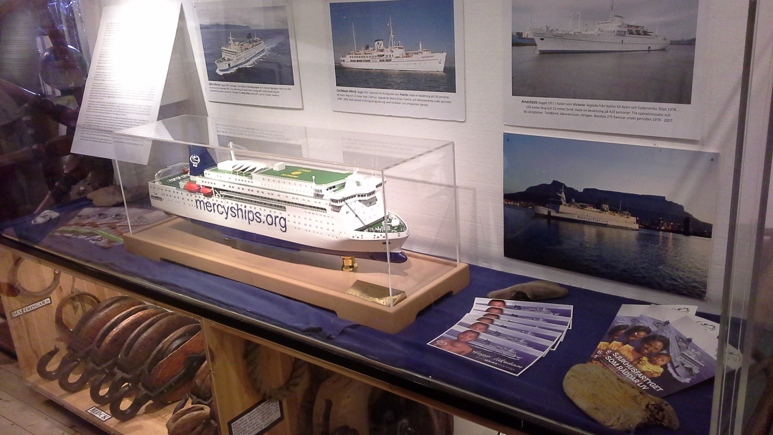 På en tv-skäm visas filmer från vardagen på fartyget och det finns också en modell av det nya sjukhusfartyget som just nu byggs på ett varv i Kina. Utställningen pågår till och med 19 augusti.