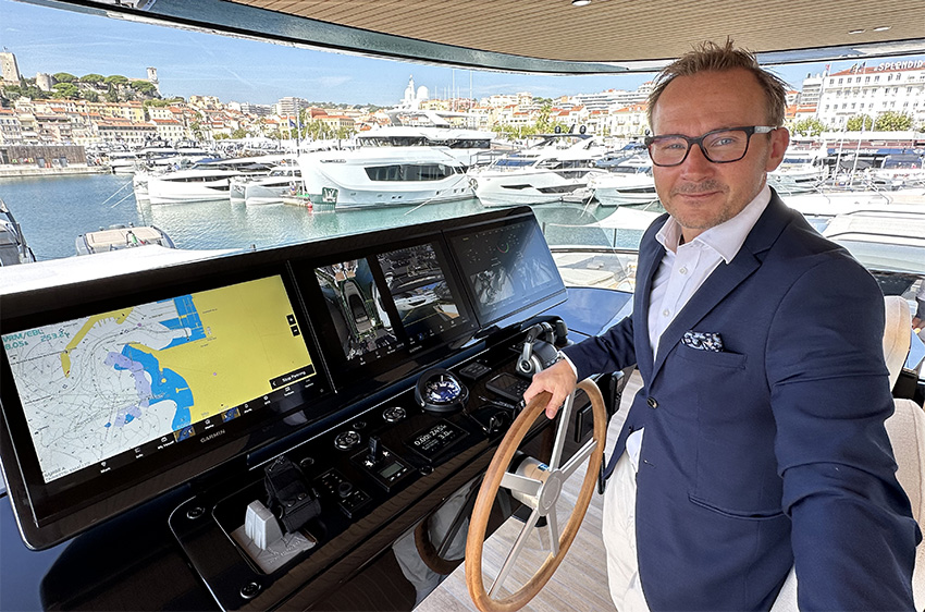 Bildtext: Pontus Fernström från Garmin visar det nya systemet ombord på en San Lorenzo på båtmässan i Cannes.