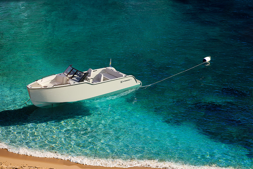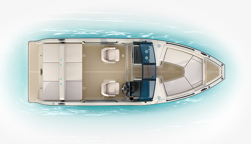 Båten har bland annat öppen akterspegel och badplattform, justerbart däcksutrymme, förvaring under förarsätet och infällbara kapell för extra komfort.