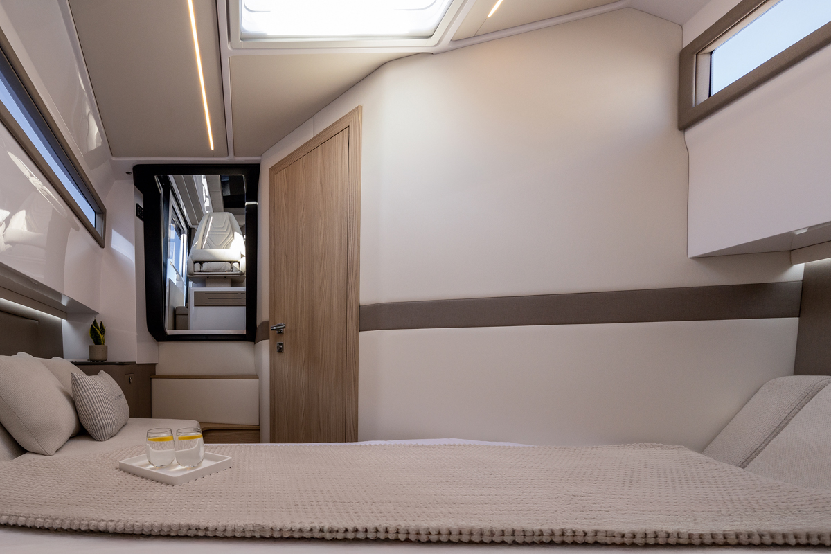 Hytterna är utformade med hög komfort. De blandar modern elegans med praktisk design och erbjuder en lugn tillflyktsort för stunderna av avkoppling efter utforskning. XPD 46 har en masterkabin och en akterkabin, som rymmer upp till fyra gäster. Dessutom finns en smart integrerad kabin under solbädden i fören med plats för ytterligare en person eller en besättningsmedlem.