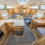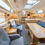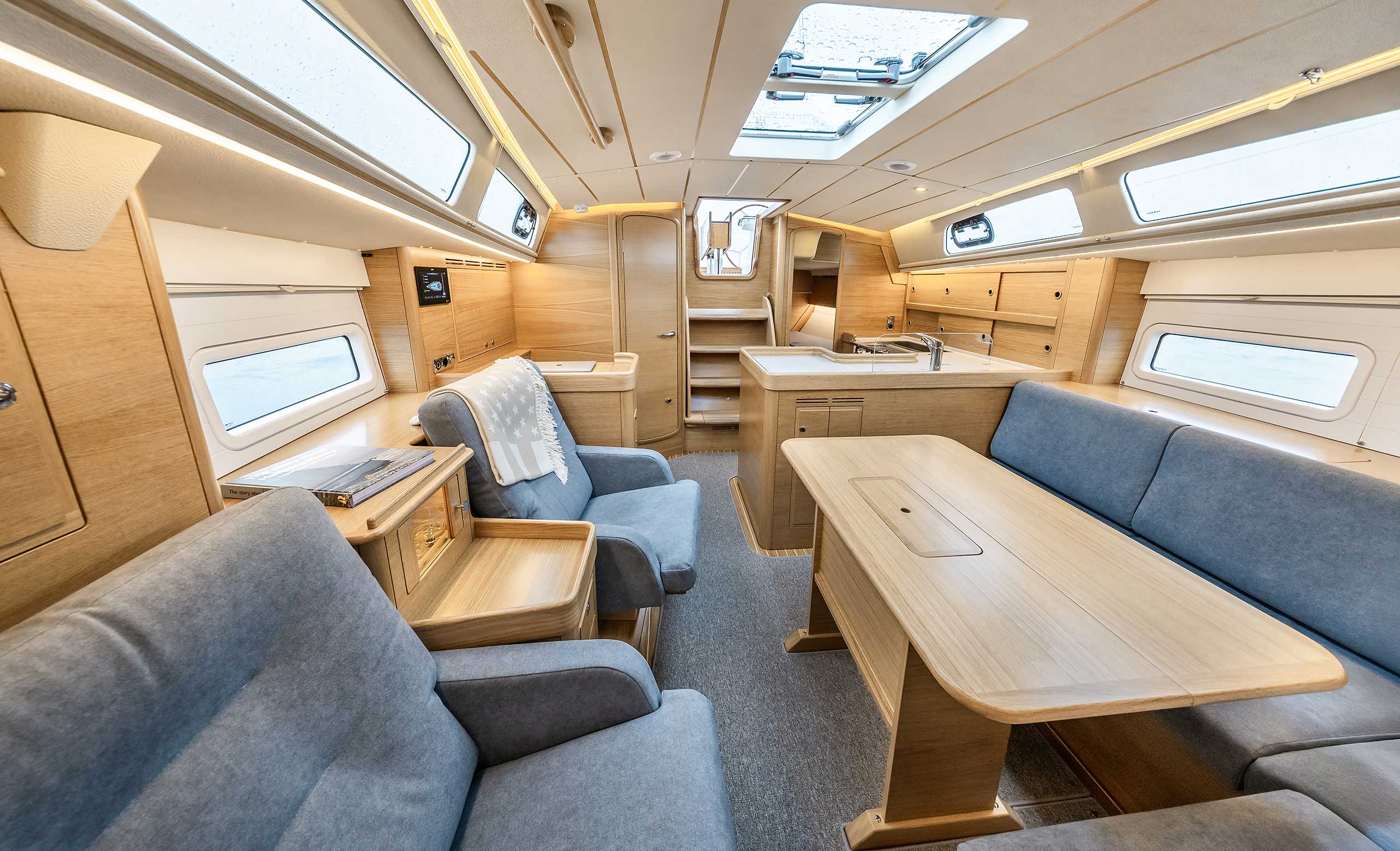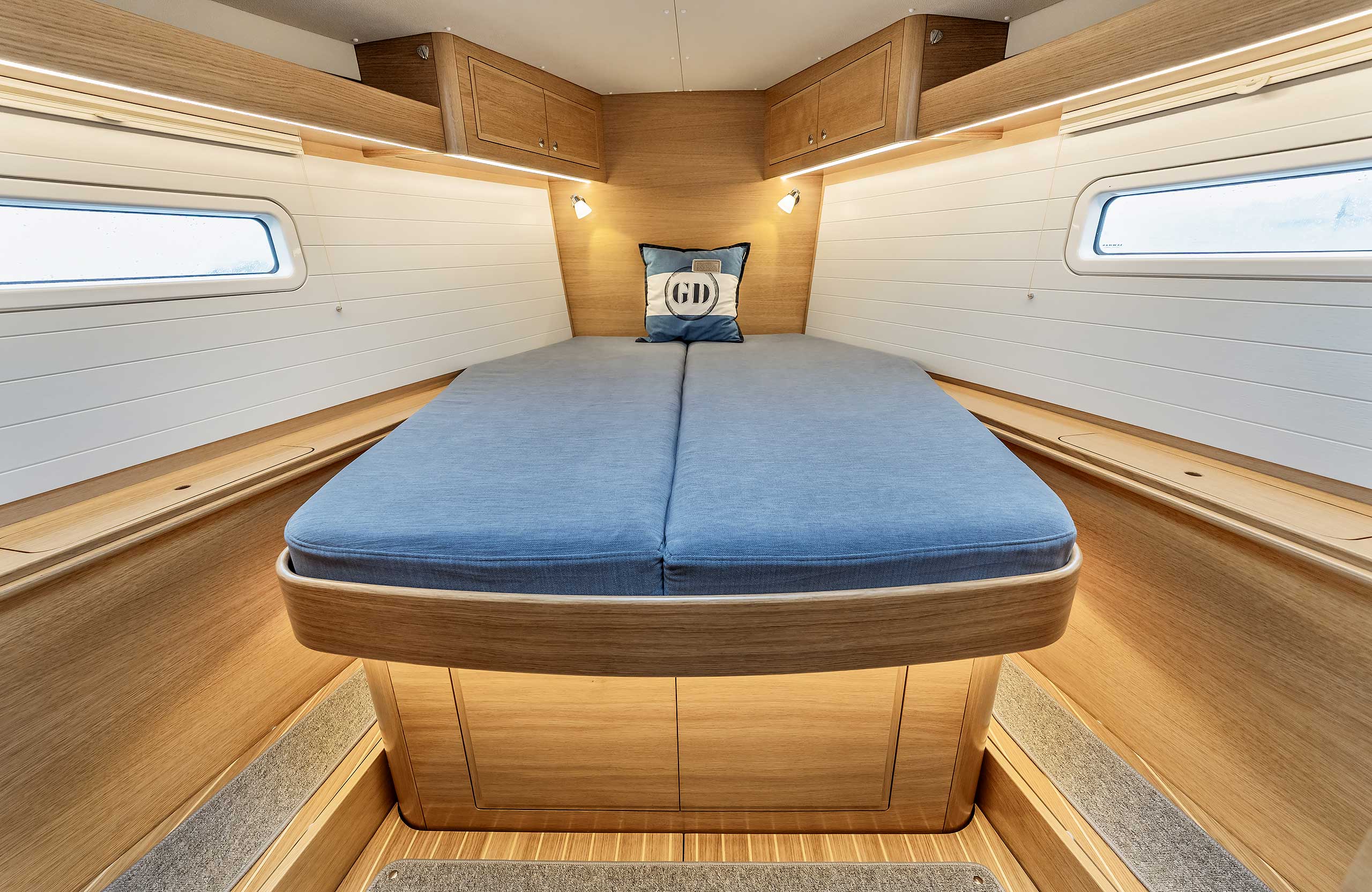För första gången i denna storleksklass erbjuder varvet fåtöljer, mittkoj i ägarkabinen i fören och extra kyl alternativ diskmaskin i pentryt.
