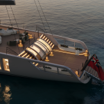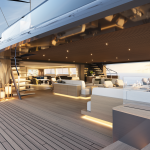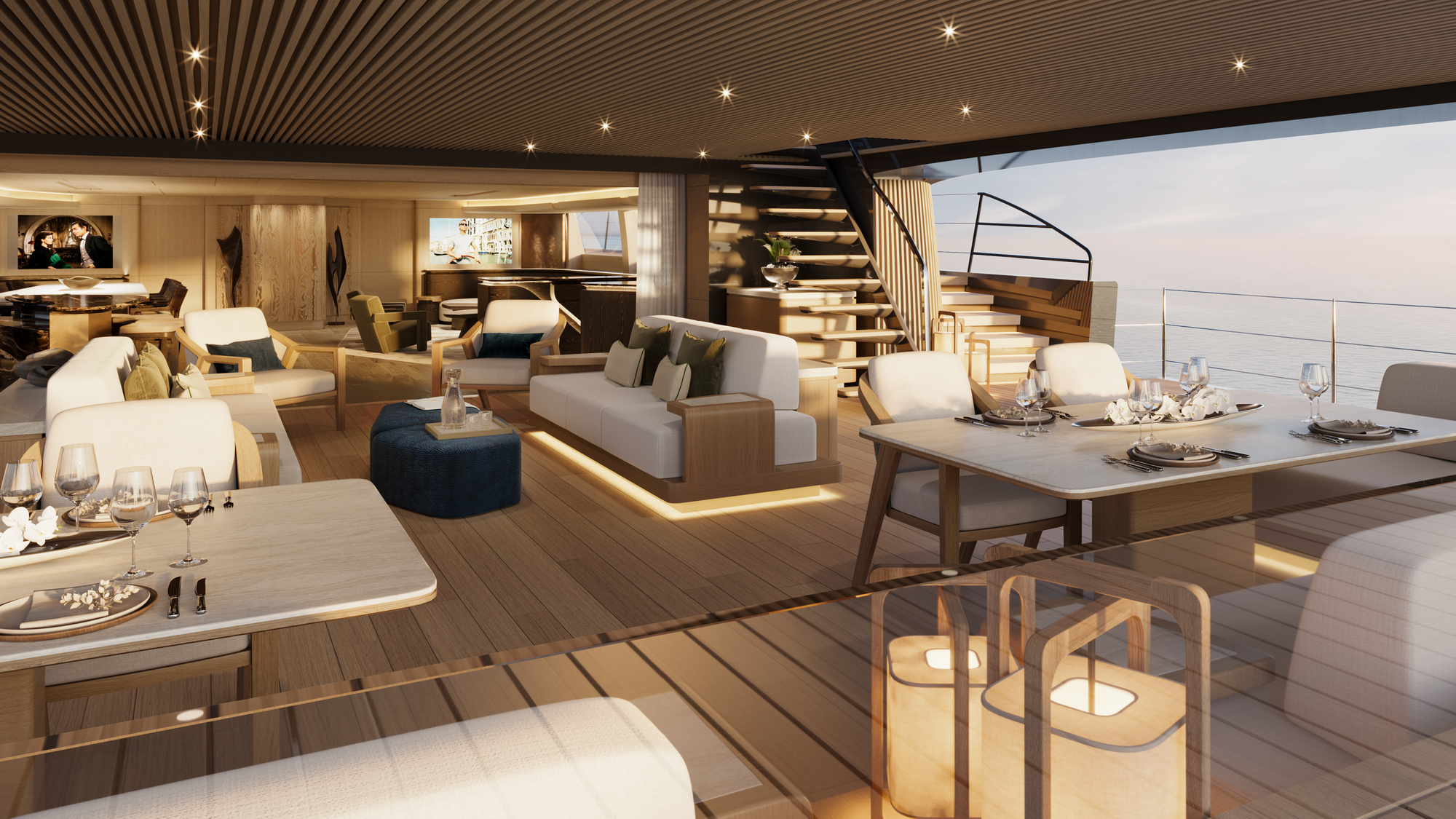 Den rymliga ägarhytten med full skrovbredd ger tillgång till det stora akterdäcket. Bekvämligheterna ombord för ägare och gäster inkluderar ett wellness-spa midskepps och ett vattensportcenter.