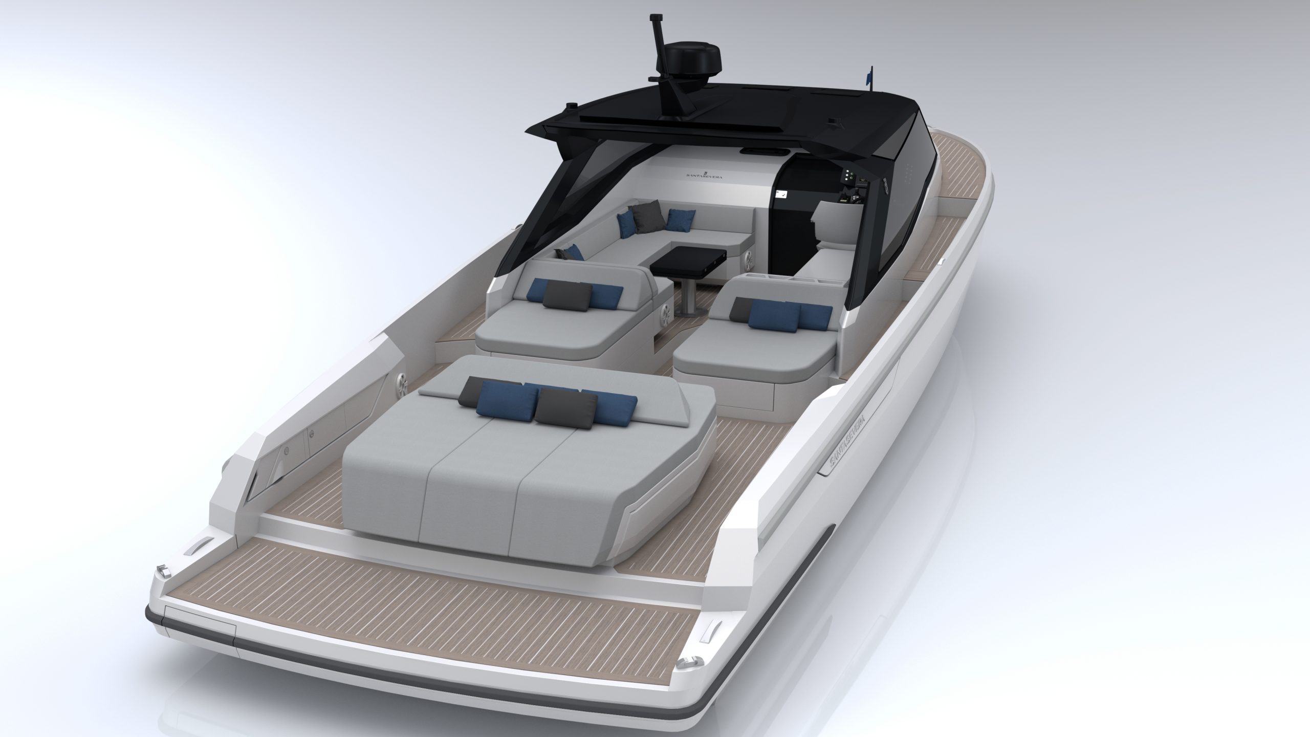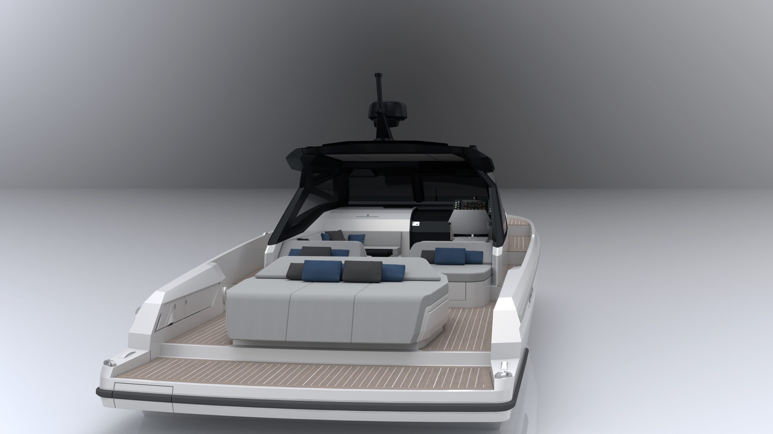 Den främre styrplatsen har god sikt. I anslutning till förarplatsen finns en väl tilltagen sittbrunn, som är i centrum ombord. Bland detaljerna märks bland annat en stor C-formad soffa och ett pentryskåp i salongen, en relaxzon med två liggsoffor och en strandklubb med solsäng samt en stor badplattform.