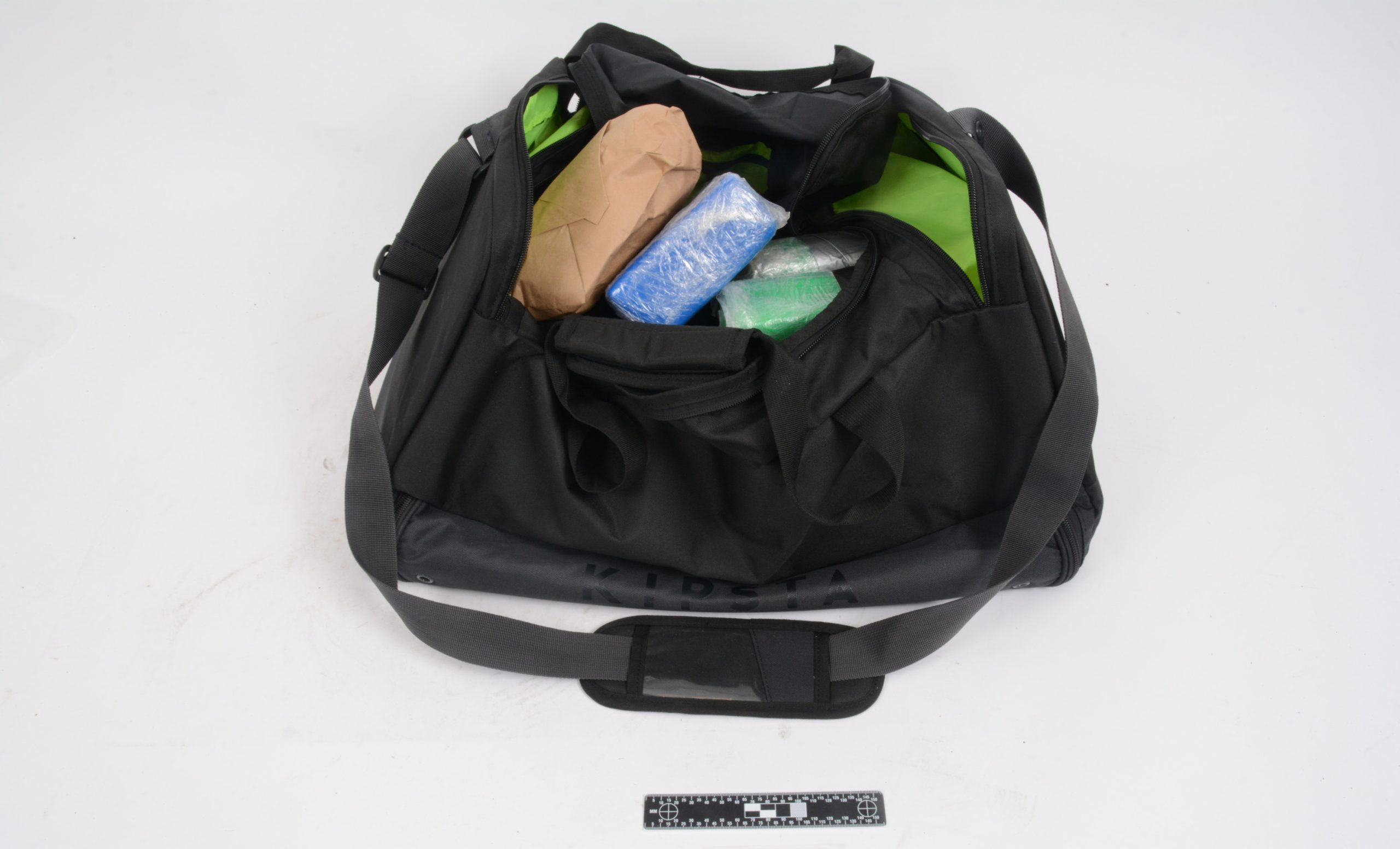 Sportbagen i husbilen innehöll cirka 14 kilo kokain. Foto: Tullverket.