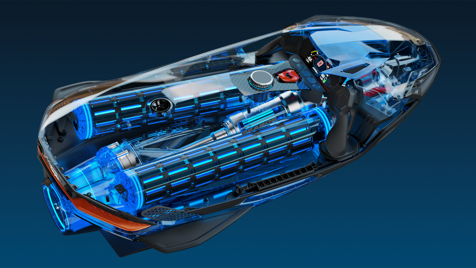 Lamborghinis design-DNA syns tydligt i Seabob SE63:s utseende och känsla. En sådan detalj är den legendariska startknappen tillsammans med det välbekanta centrala kolfiberelementet, välkänt från Lamborghinis superbilar. Seabob SE63:s digitala hastighetsmätare visar de distinkta originalsiffrorna från Lamborghini.