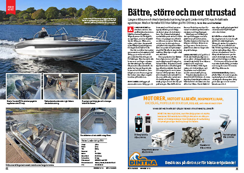 4 december, 2025Bättre, större och mer utrustad Dela på FacebookDela på TwitterDela på Linkedin Längre sittbrunn och ökad standardutrustning har gett Linder Arkip 570 nya, förbättrade egenskaper. Med en Yamaha 100 hk är båten god för 38 knop. – Ur Båtliv 6-25 FöregåendeFöregående inlägg:Förvirrande undersökning NästaNästa inlägg:MÖTE MED HETT NATURFENOMEN