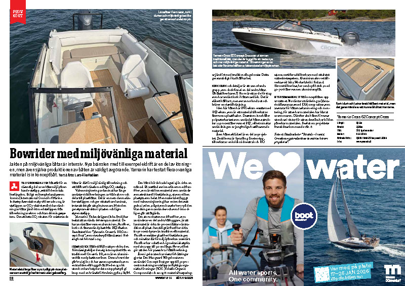 4 december, 2025Bowrider med miljövänliga material Dela på FacebookDela på TwitterDela på Linkedin Jakten på miljövänliga båtar är intensiv. Nya bränslen med till exempel eldrift är en del av lösningen, men även själva produktionen av båten är väldigt avgörande. Yamarin har testat flera ovanliga material i sin konceptbåt. – Ur Båtliv 6-25 FöregåendeFöregående inlägg:”FUSKBYGGET” SOM BLEV EN SUCCÉ NästaNästa inlägg:Årets Båtklubb 2025 – dags att nominera nästa vinnare