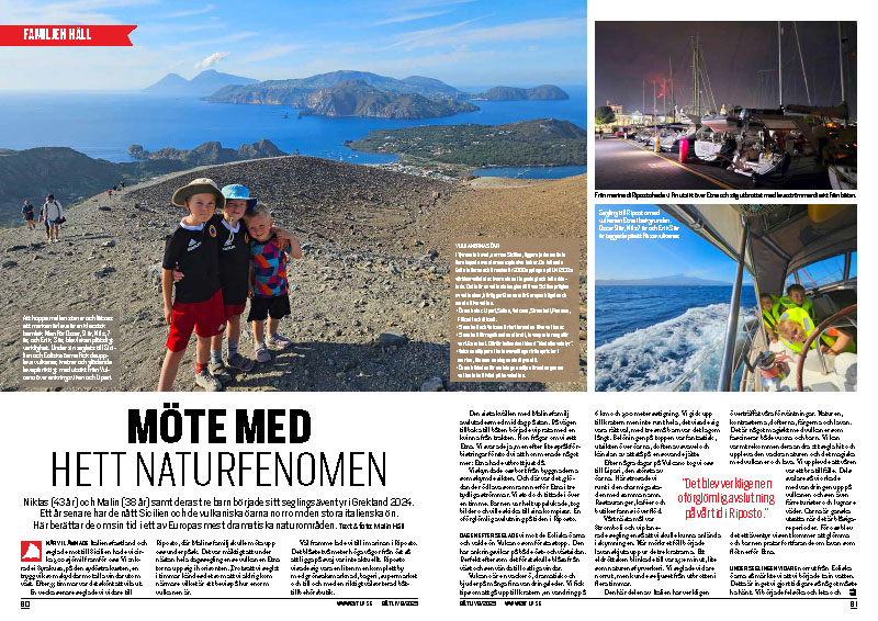Niklas (43 år) och Malin (38 år) samt deras tre barn började sitt seglingsäventyr i Grekland 2024. Ett år senare har de nått Sicilien och de vulkaniska öarna norr om den stora italienska ön. Här berättar de om sin tid i ett av Europas mest dramatiska naturområden. – Ur Båtliv 6-25