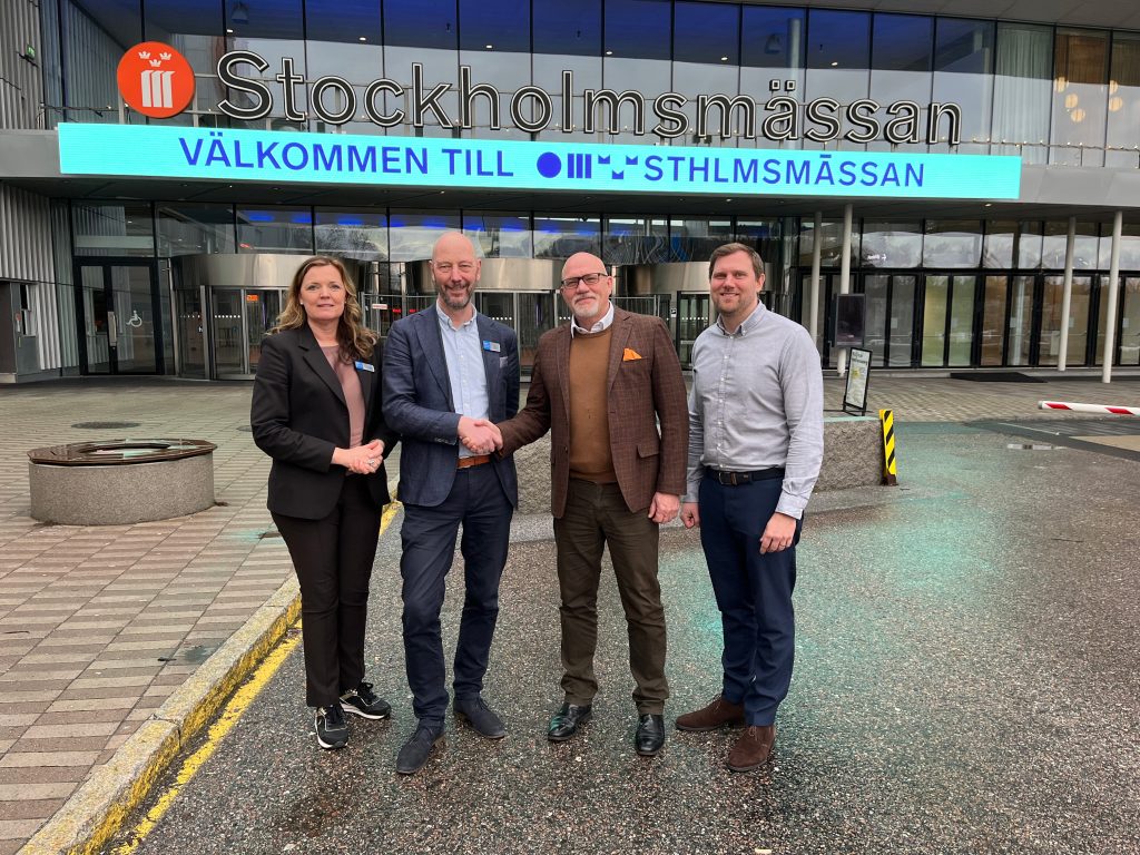 På bilden syns fr. v. Anna-Karin Werner, affärsområdeschef Congresses & Guest Events, Stockholmsmässan, Mats Viker, vd Stockholmsmässan, Ulf Ottosson, vd Numera Mässor, Viktor Ottosson, vice VD, Numera Mässor.