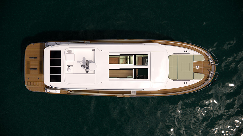 Genom att ta bort flybridge återfår 495 Coupé utrymme och funktionalitet som direkt tjänar den som ger sig ut på längre resor. Den mest omedelbart märkbara skillnaden finns ovanför. Utan flybridge erbjuder Coupén en betydligt större taklucka i glas som fyller salongen med naturligt ljus. Detta har varit ett kännetecken för Nimbus Coupémodeller i decennier, och 495 tar det längre än någon tidigare modell.