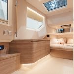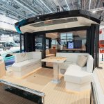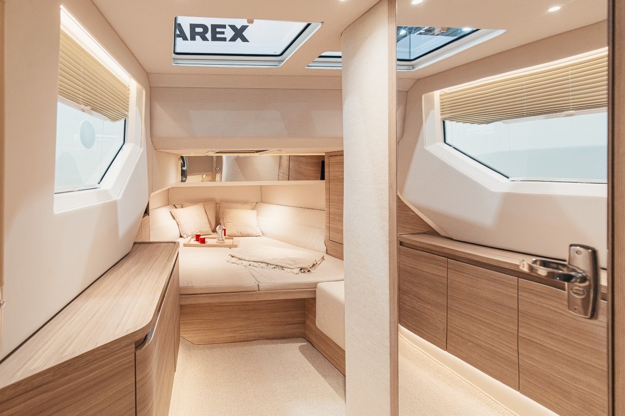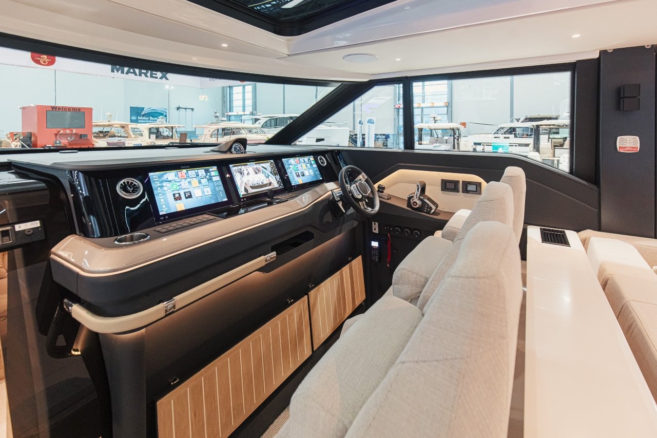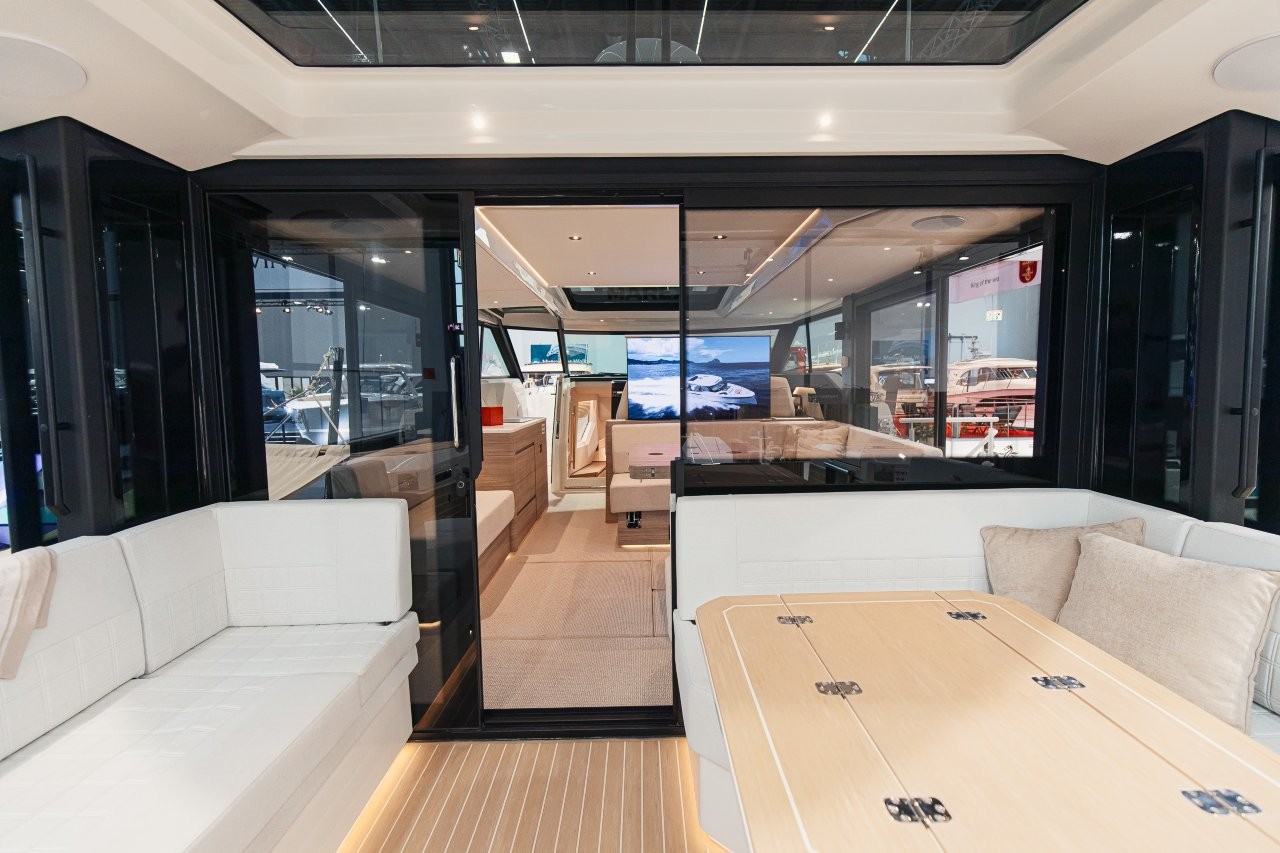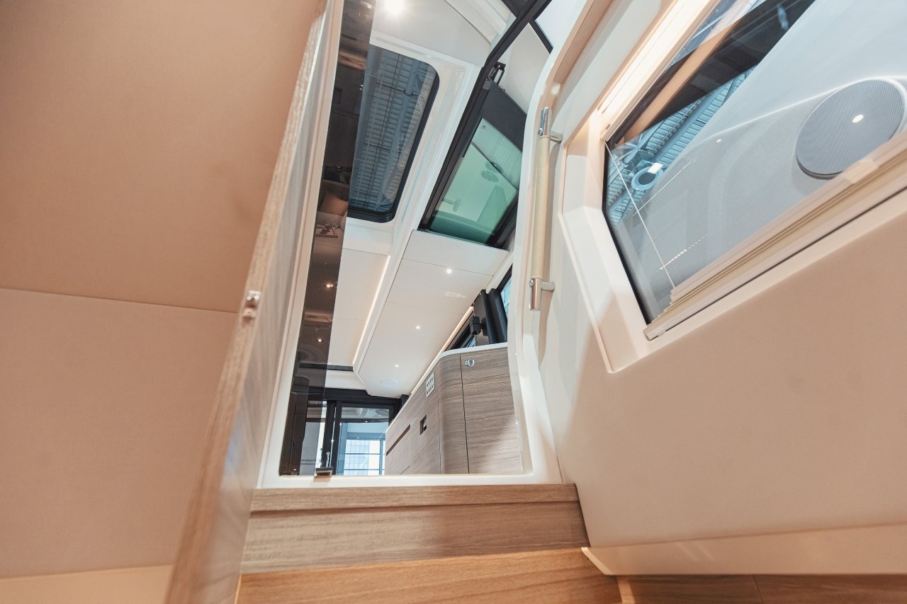 Båten har en stor kabin med många funktioner som gör att man till exempel kan öppna kabinen sömlöst med olika eldrivna funktioner. Dubbla sidodörrar gör att styrhytten smälter samman naturligt med utomhusmiljön medan ett stort pentry förbättrar upplevelsen ombord med gott om möjligheter för matlagning och samvaro.