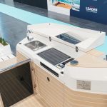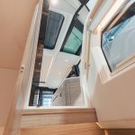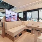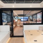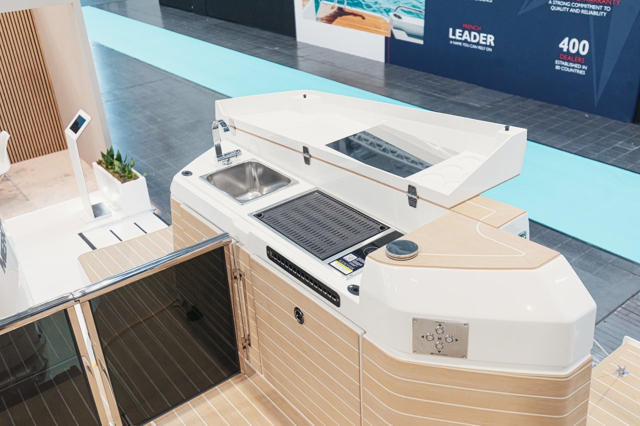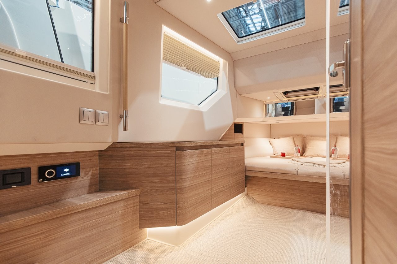 För om pentryt har båten en innovativ tvådelad dörrlösning till den stora konvertibla fördäckssalongen genom en övre sektion som lyfts och skjuts in i taket, vilket gör att den nedre sektionen kan öppnas med gångjärn. Akterut öppnar ett halvhögt fönster i kombination med en babordsdörr salongen mot den expansiva öppna sittbrunnen, vilket förstärker känslan av rymd och kontakt med vattnet. Många möjligheter alltså, men det fungerar bra på mässbåten.
