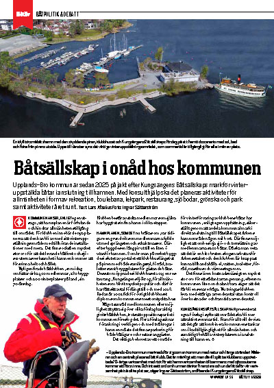 Upplands-Bro kommun är sedan 2025 på jakt efter Kungsängens Båtsällskaps mark för vinteruppställda båtar i anslutning till hamnen. Med konsulthjälp ska det planeras aktiviteter för allmänheten i form av rekreation, boulebana, lekpark, restaurang, sjöbodar, grönska och park samt aktiviteter året runt. – Ur Båtliv 1-26