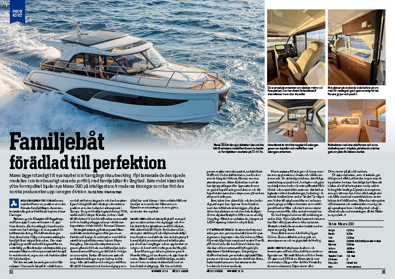 Marex lägger ständigt till nya kapitel i sin framgångsrika utveckling. Ifjol lanserade de den sjunde modellen i sin kontinuerligt växande portfölj med familjebåtar för långfärd. Bakom det klassiska yttre formspråket bjuder nya Marex 390 på intelligenta och moderna lösningar som har fört den norska producenten upp i en egen division. – Ur Båtliv 1-26