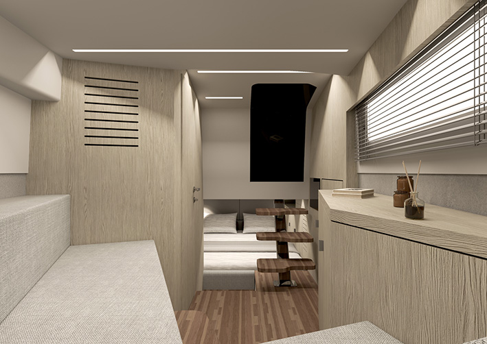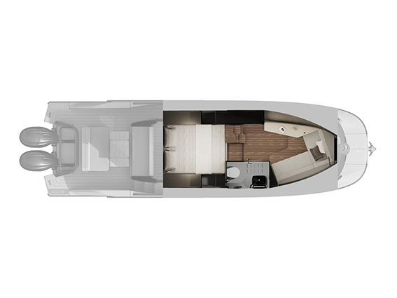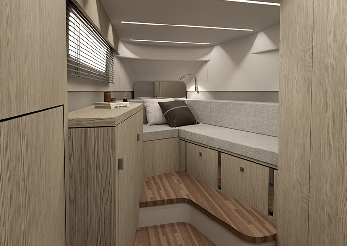 Den kompakta MP10 har en matplats med en soffa vars ryggstöd både kan lutas och fällas ner, vilket gör att den fungerar som sittplats vid bordet eller som solsäng. MP10 har boendemöjligheter, en matplats utrustad med en bäddsoffa, en dubbelkoj akteröver och ett badrum med dusch. Bekväma sidodäck ger enkel tillgång till fördäck i båda modellerna.